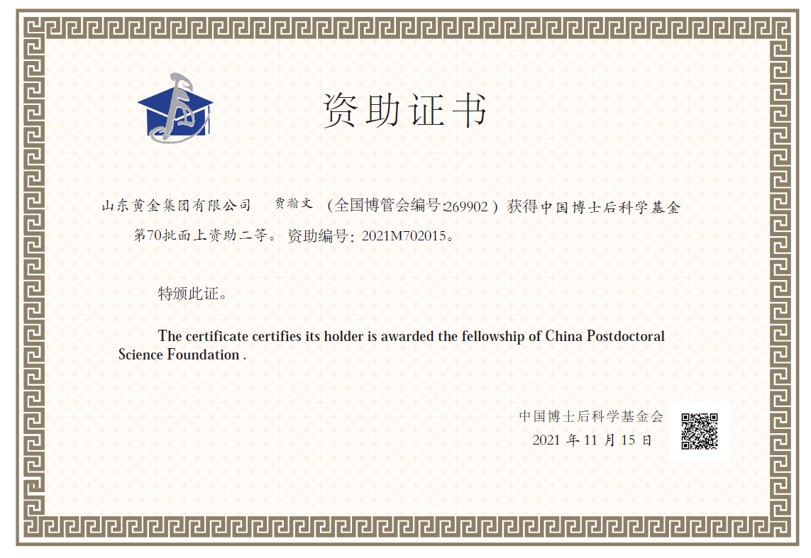 發(fā)布日期:2021.11.26近日,山東省人力資源和社會(huì)保障廳、中國(guó)博士后科學(xué)基金會(huì)先后公布了2021年度山東省博士后創(chuàng)新項(xiàng)目和中國(guó)博士后科學(xué)基金第70批面上資助名單,集團(tuán)博士后科研工作站賈瀚文博士研究的課題《采動(dòng)影響下膠西北地區(qū)深部金礦硬巖采場(chǎng)頂板冒落預(yù)警機(jī)理研究》均榜上有名。
