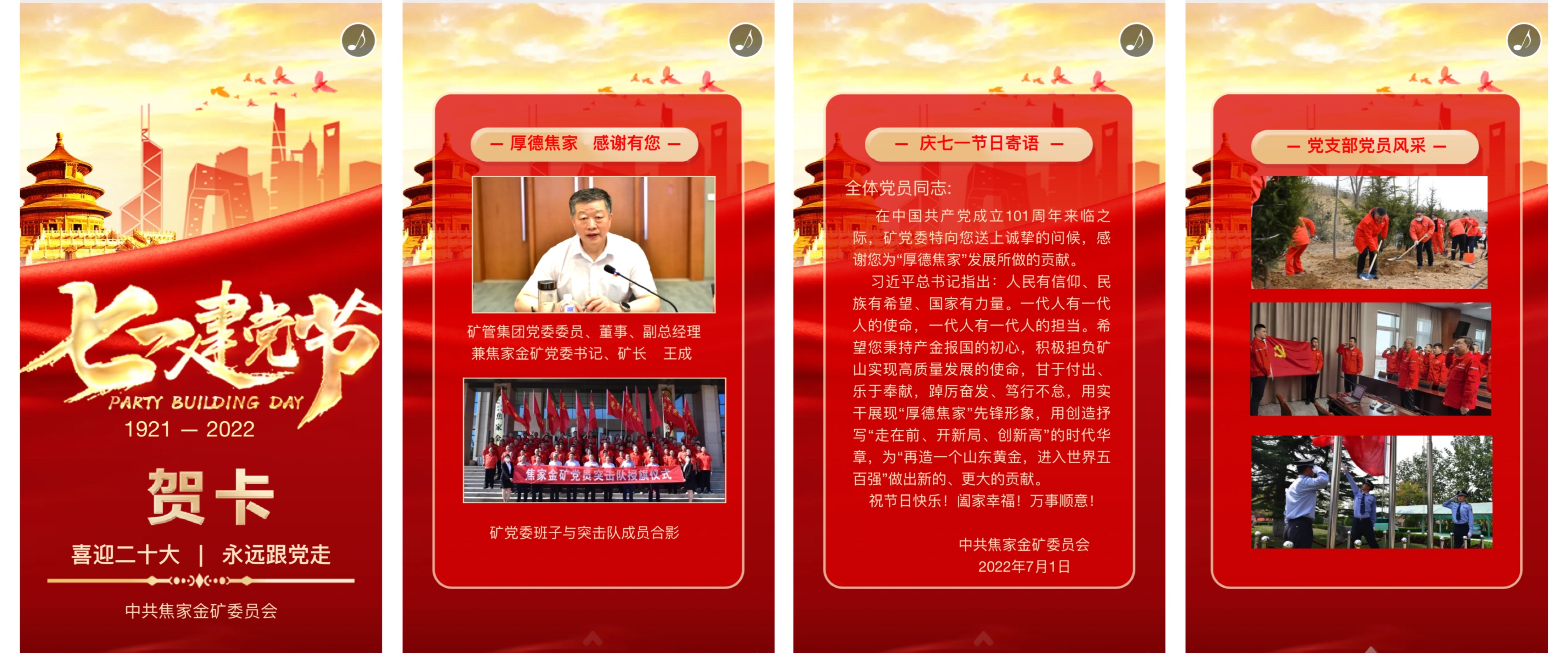 發(fā)布日期:2022.07.016月30日,為熱烈慶祝中國(guó)共產(chǎn)黨成立101周年,焦家金礦黨委創(chuàng)新工作思路,為全體黨員精心制作了一份特殊的政治生日禮物——《焦家金礦慶七一建黨節(jié)節(jié)日寄語(yǔ)電子賀卡》。
